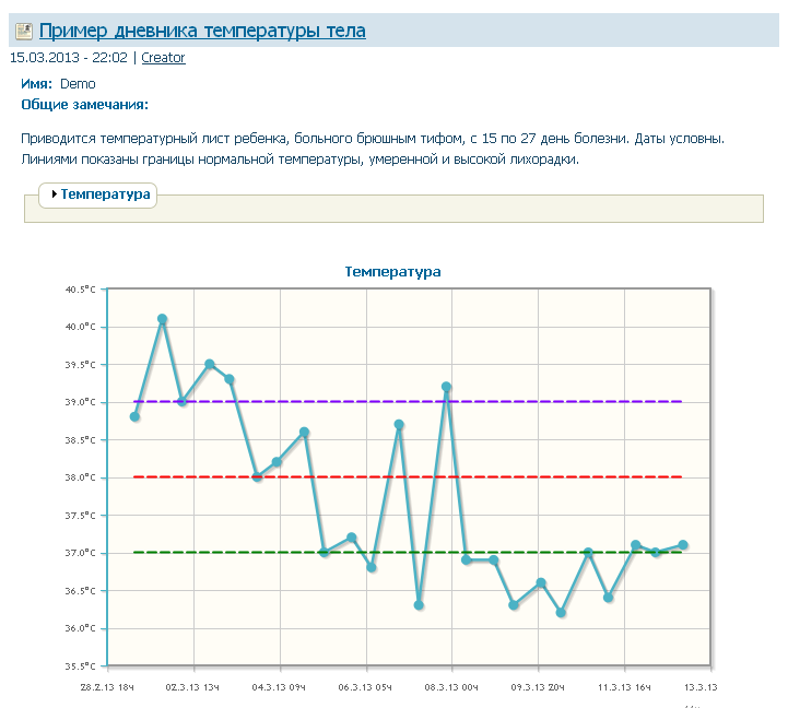 Частота заболеваний с повышением температуры в течение года также показательна и может характеризовать состояние иммунитета как ребенка, так и взрослого. Она легко определяется путем вывода графика за год или за любой другой период времени по данным из всех дневников по выбранному человеку (для этого в каждый дневник вносится имя).