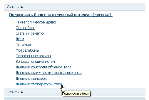 В развернувшемся списке кликните по названию дневника или другого нужного вам материала, и соответствующий блок будет выведен на вашей личной странице (или будет добавлен дневник в уже имеющемся блоке «Дневники и медицинские карты»):