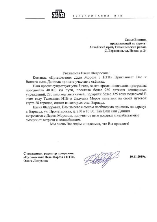 Однажды, увидев по телевизору передачу про путешествие Деда Мороза, который исполняет мечты, мы с сыночком решили написать ему письмо с нашей мечтой. но наша мечта стоит очень дорого… Мы просили помочь нам попасть на лечение, которое необходимо Даниилу, но сами мы его оплатить не можем. Написали и забыли. Но вот, спустя почти два года, наше письмо дошло до дедушки и нам ответили! Нас с Даниилом пригласили на съёмку для передачи на канале НТВ "Путешествие Деда Мороза по городам России"! Состоится встреча уже 15 ноября. Чтобы поехать, нам нужно нанять машину на целый день для поездки. А у нас затруднения с финансами… Но так хочется подарить ребёнку праздник! Ищем Добрых Волшебников и Фей, которые помогут нам осуществить эту поездку на праздник детства! Случилось одно волшебство, должно случиться и второе. Мы очень на это надеемся!