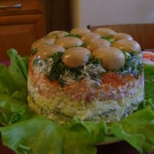 1 слой салата шампиньоны целые выкладываются шляпками вниз